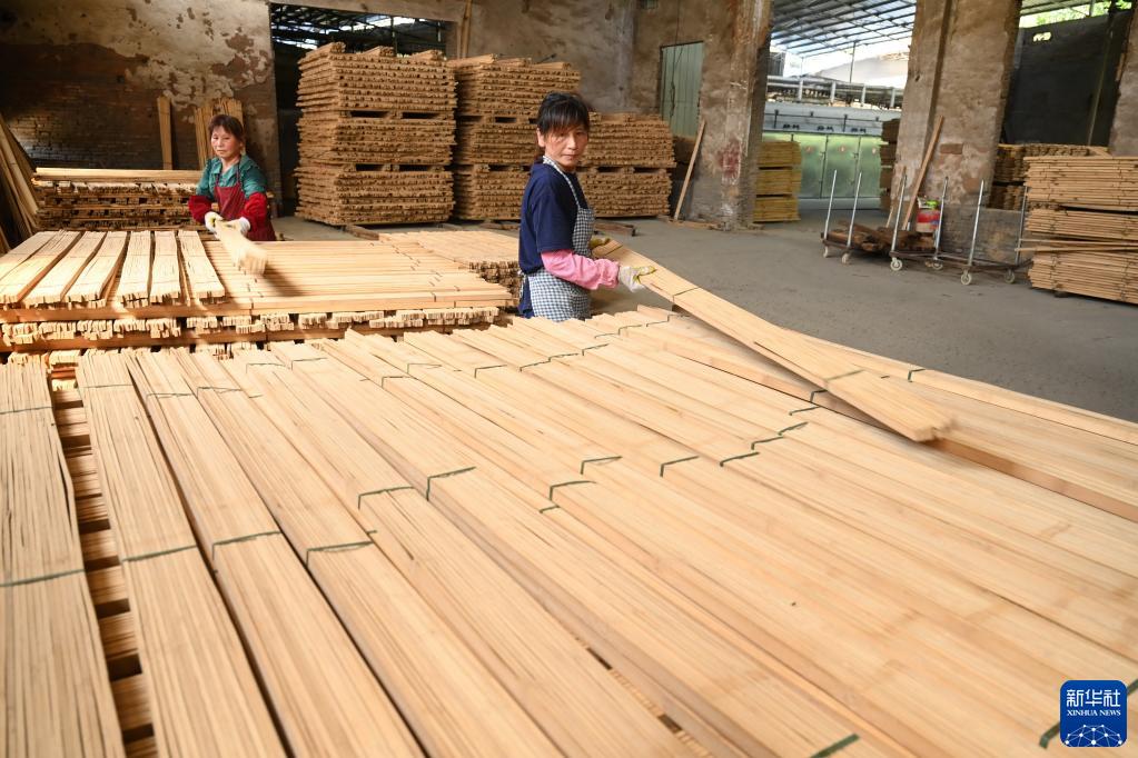 8月9日,建甌市恒順炭業(yè)有限公司工人在整理用來(lái)制作竹家居工藝品的竹條。