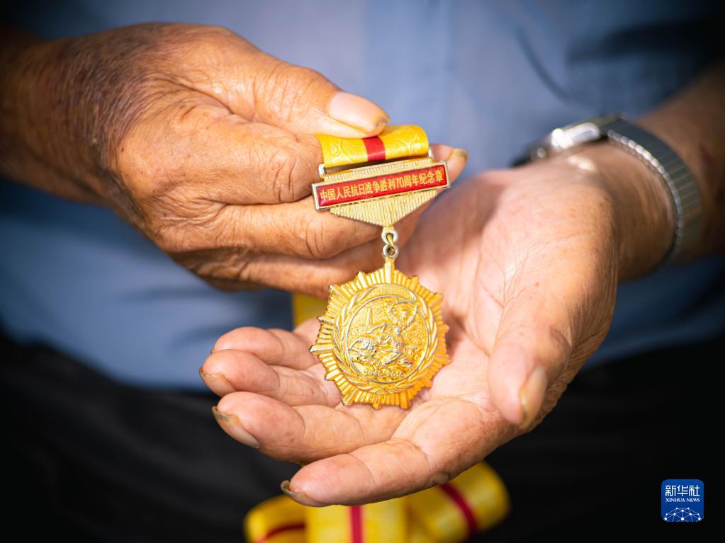 7月27日,在浙江省溫嶺市,抗戰老戰士牟錫志展示紀念章。