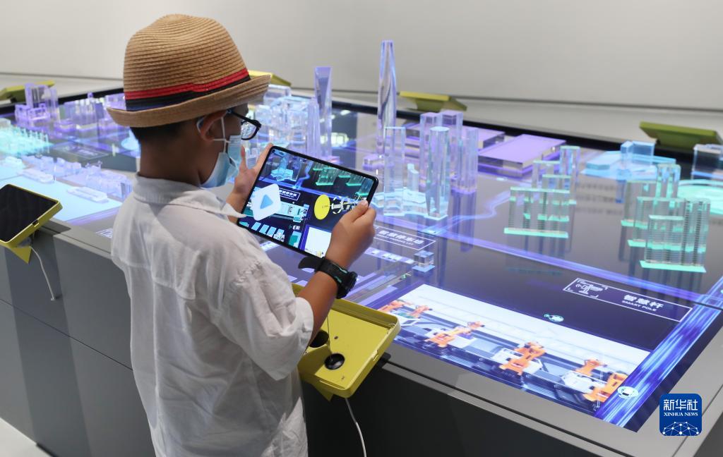 8月11日,一位小朋友在上海城市規劃展示館使用掌上電腦觀(guān)看城市建筑功能講解演示。