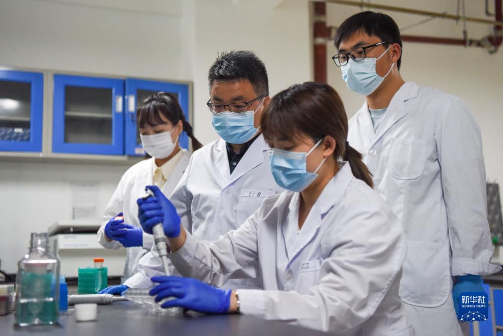 在新疆畜牧科學(xué)院,中國農業(yè)大學(xué)動(dòng)物科學(xué)技術(shù)學(xué)院教授李孟華(左二)帶領(lǐng)團隊成員進(jìn)行細胞免疫熒光實(shí)驗(8月6日攝)。新華社記者 丁磊 攝