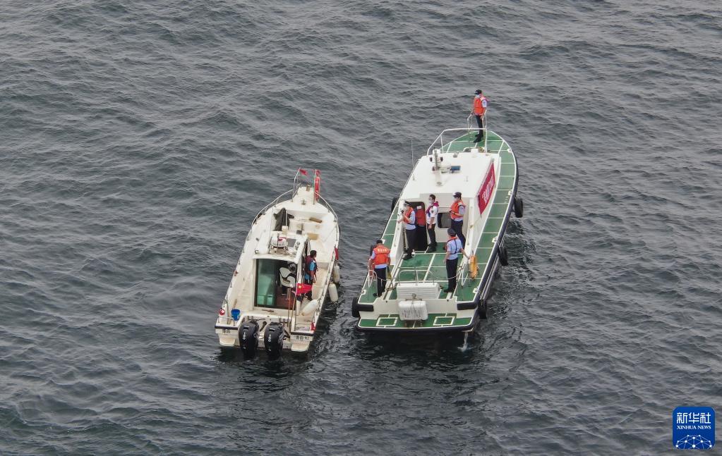8月10日,執法人員在相關(guān)海域檢查船只(無(wú)人機照片)。