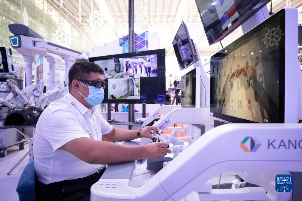 8月11日,在2022世界5G大會(huì )展廳里,參展商演示5G網(wǎng)絡(luò )支持下的遠程手術(shù)設備。