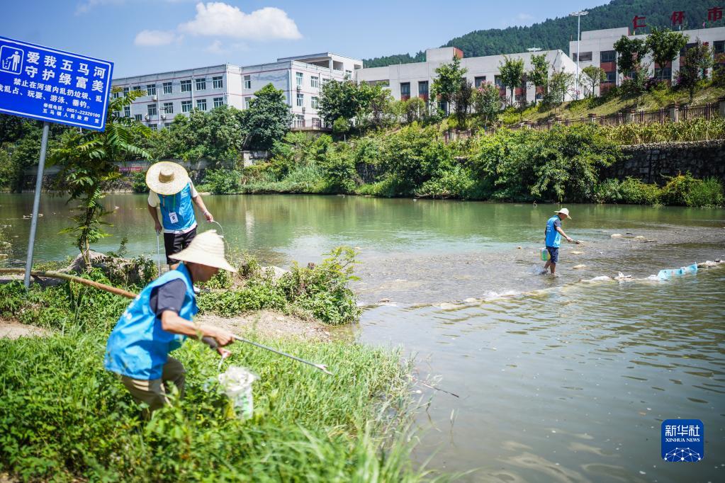 仁懷市五馬鎮生態(tài)環(huán)境保護協(xié)會(huì )會(huì )員在五馬河岸邊清理垃圾(8月4日攝)。