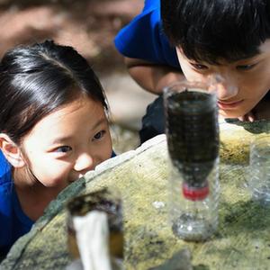 8月10日,在陜西漢中黎坪國家森林公園,研學(xué)團隊的老師為小朋友講解過(guò)濾凈水法。