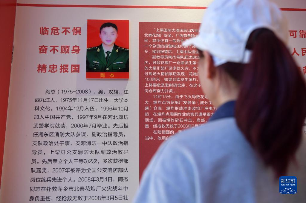 8月9日,陶佳煜在萍鄉市上栗縣消防救援大隊陳列館陶杰烈士紀念展區前緬懷父親。