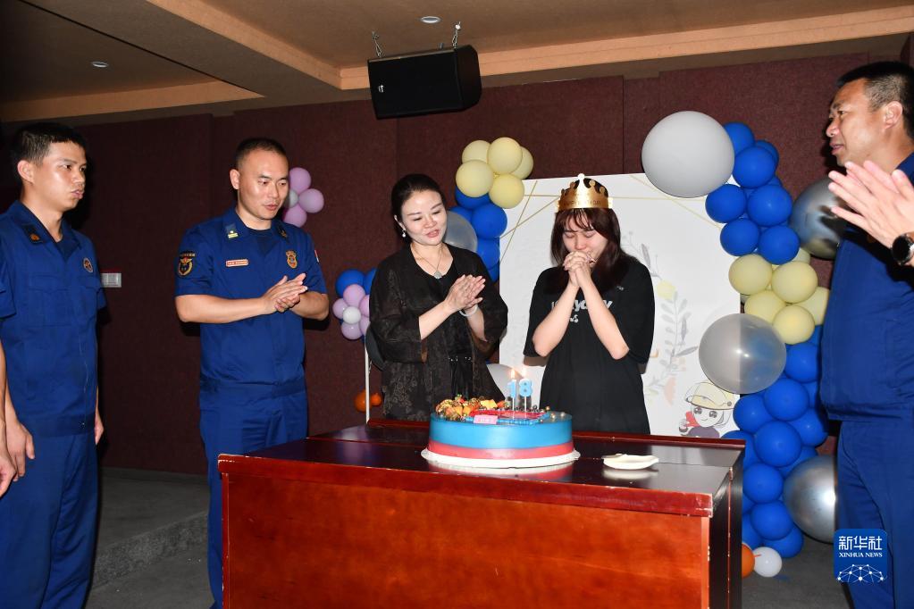 萍鄉市消防救援支隊的消防員們?yōu)樘占鸯希ㄓ叶c祝18歲生日(7月11日攝)。
