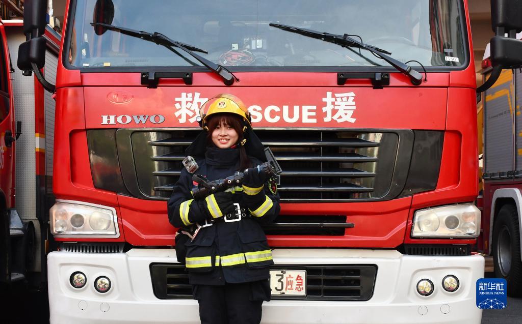 陶佳煜穿上消防服在萍鄉市消防救援支隊的消防車(chē)前留影(7月11日攝)。