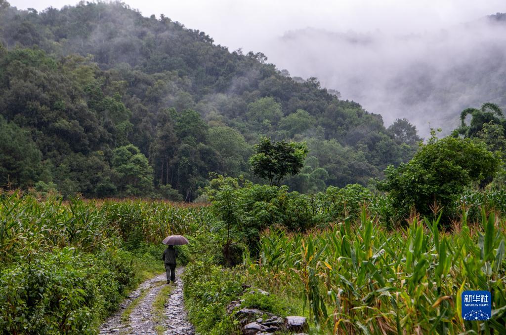 由于下雨,無(wú)法使用無(wú)人機監測,遲遲沒(méi)有找到象群位置的刁發(fā)興徒步進(jìn)入山區尋找(8月1日攝)。新華社記者 江文耀 攝