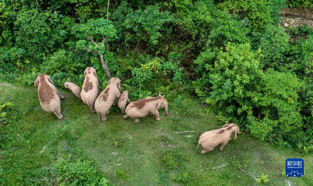 象群在云南省普洱市江城哈尼族彝族自治縣山林間覓食(無(wú)人機照片,8月1日攝)。新華社記者 江文耀 攝