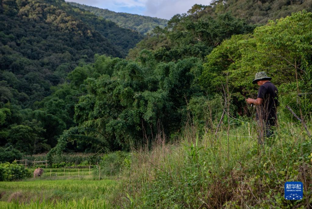 刁發(fā)興使用無(wú)人機監測象群,不遠處一頭亞洲象正在覓食(8月1日攝)。新華社記者 江文耀 攝
