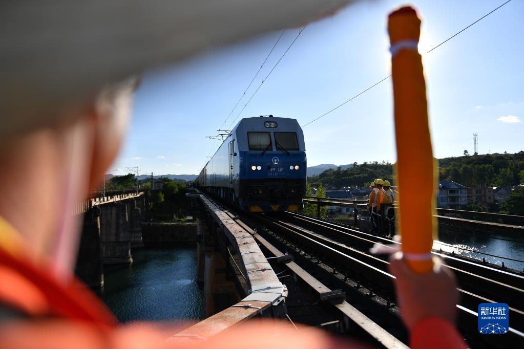 8月11日,在滬昆鐵路新舞水鋼梁橋,橋隧工等待列車(chē)通過(guò)后繼續巡檢作業(yè)。