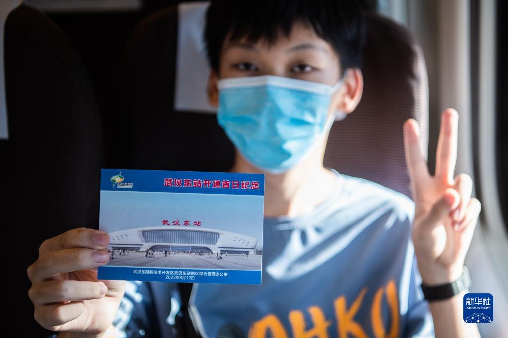 8月12日,乘坐武漢東站首發(fā)列車(chē)的旅客展示武漢東站開(kāi)通紀念品。