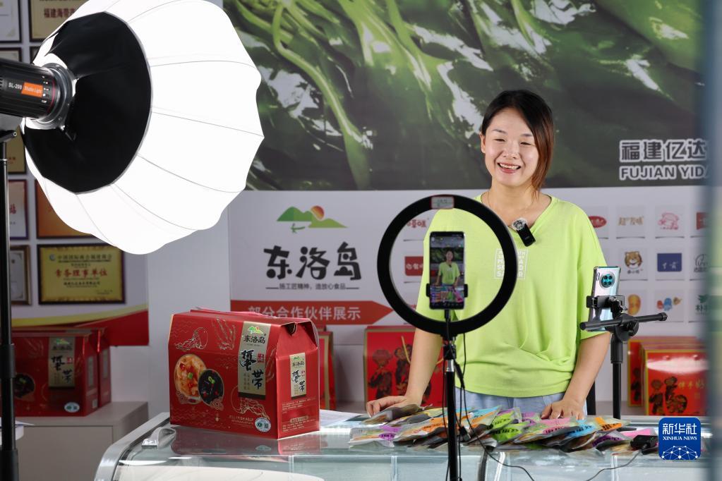 福建省連江縣一名帶貨主播在直播間介紹東洛島海產(chǎn)品(8月9日攝)。