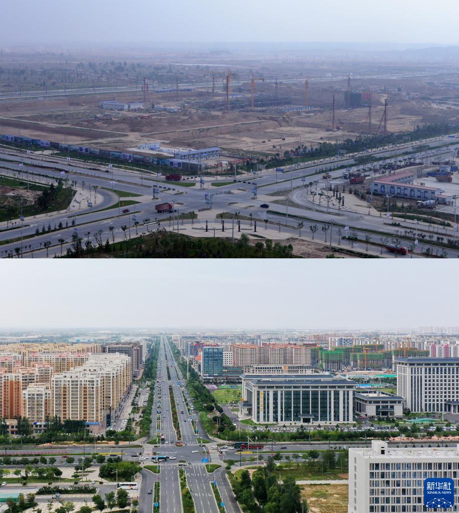 拼版照片:上圖為2013年8月22日拍攝的蘭州新區黃河大道周邊風(fēng)貌(蘭州新區供圖);下圖為2022年8月10日拍攝的蘭州新區黃河大道周邊風(fēng)貌(無(wú)人機照片,新華社記者陳斌攝)。