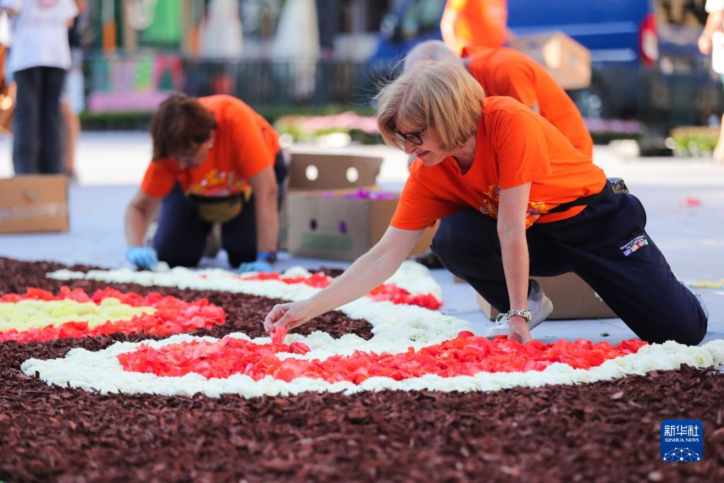 8月12日,工作人員在比利時(shí)布魯塞爾大廣場(chǎng)鋪裝“鮮花地毯”。