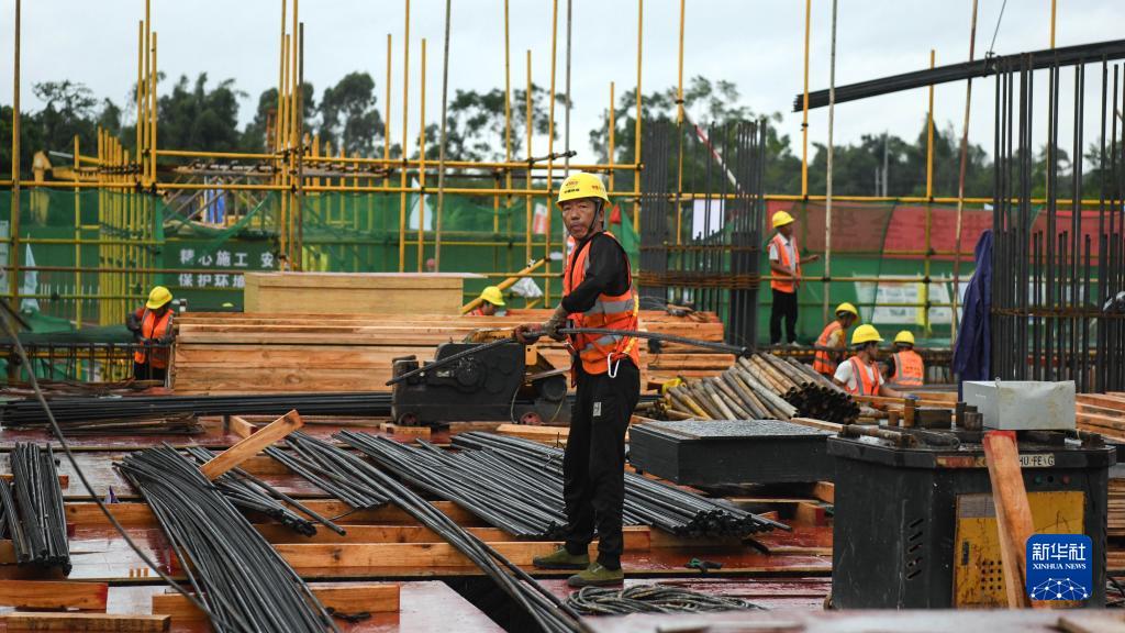 在南玉高鐵玉林北站工地,工人在搬運鋼筋(8月12日攝)。