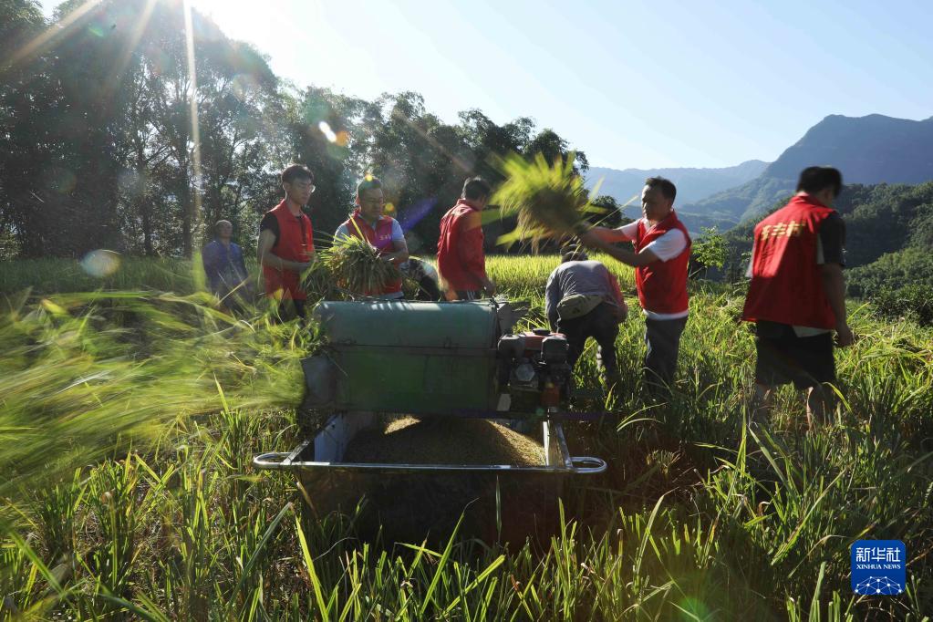 8月13日,貴州省赤水市寶源鄉的黨員志愿者在玉豐村幫助農戶(hù)收割水稻。