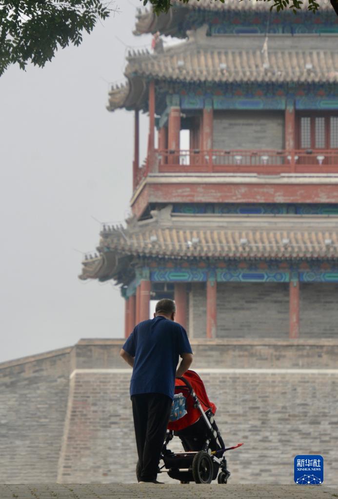 8月13日,市民在南中軸線(xiàn)御道景觀(guān)區的永定門(mén)城樓前休閑。