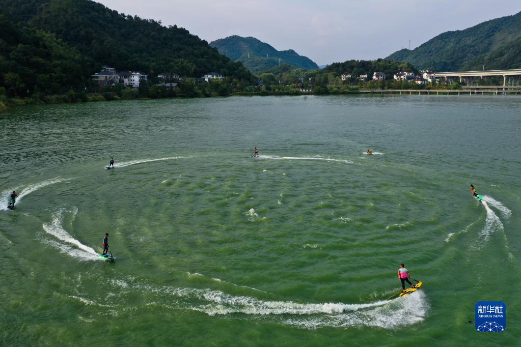 8月13日,工作人員在建德市楊村橋鎮十里埠黃金水岸國際濱水公園旁的水面上進(jìn)行水上表演(無(wú)人機照片)。