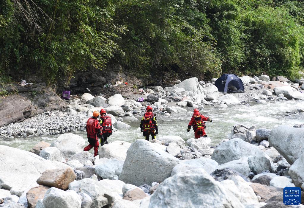 8月14日,在四川省彭州市龍門(mén)山鎮龍槽溝,消防救援人員在河道搜救。