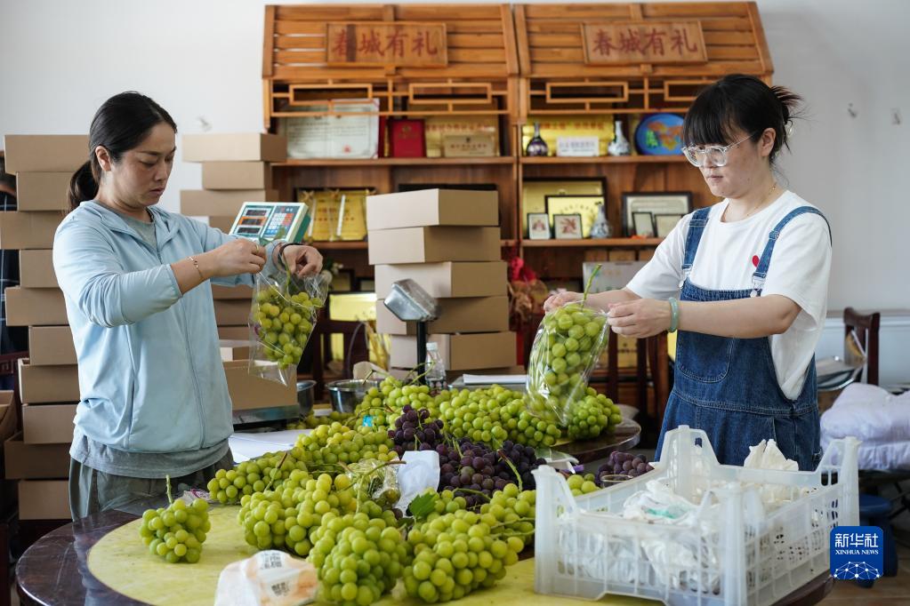 8月13日,王娟(左)和回家省親的妹妹王月在合作社包裝葡萄。