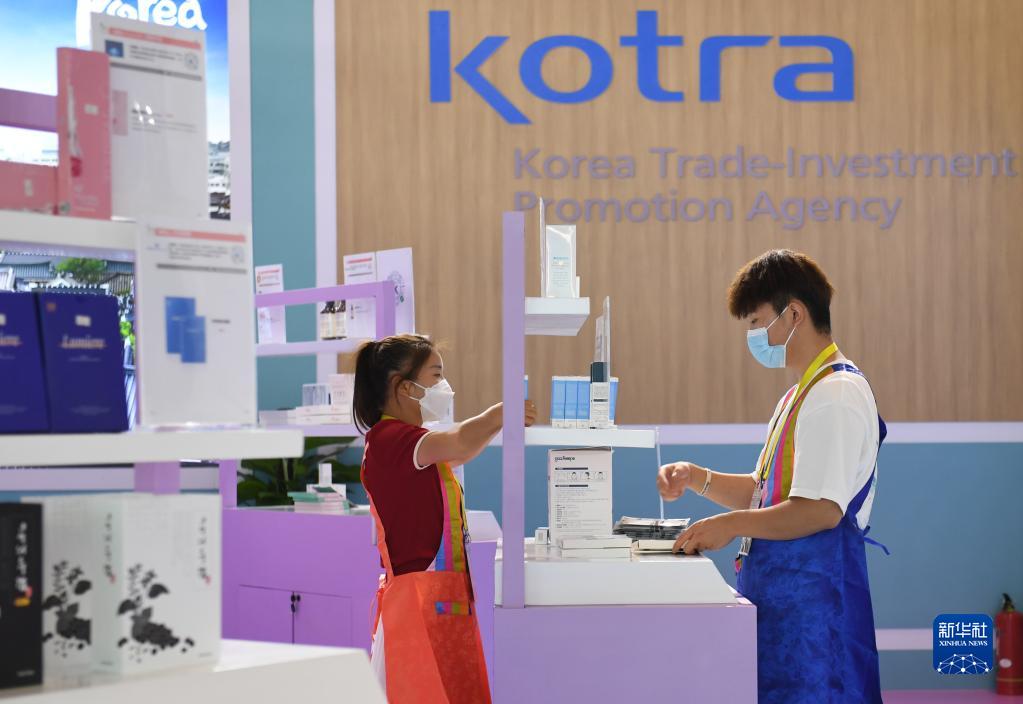 8月14日,西安國際會(huì )展中心國際館韓國展區的店員在整理商品。
