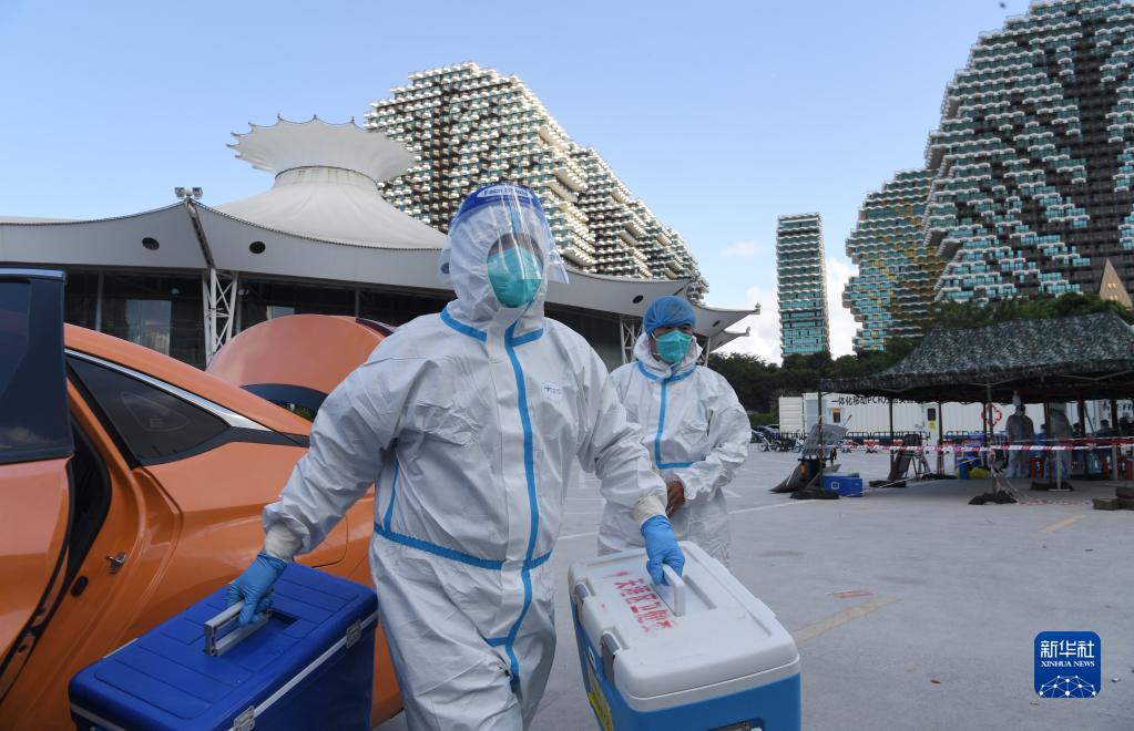 8月14日,在位于三亞市美麗之冠大劇院的核酸樣本轉運點(diǎn),志愿者轉運核酸樣本。