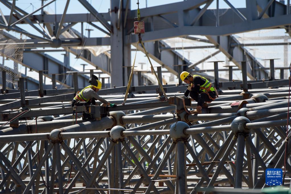 8月15日,工人在呼和浩特新機場(chǎng)工程施工現場(chǎng)作業(yè)。
