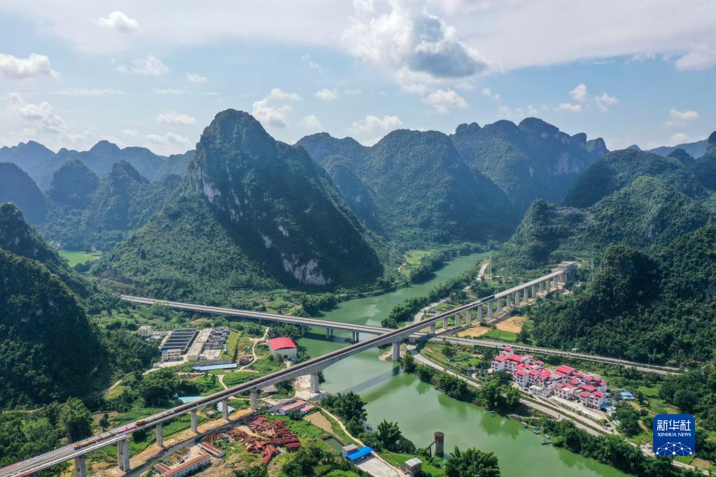 這是8月16日拍攝的貴南高鐵廣西段龍江雙線(xiàn)特大橋(無(wú)人機照片)。