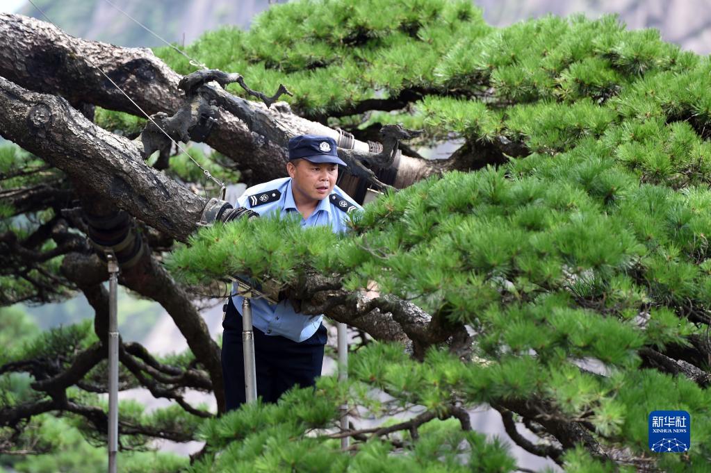8月14日,胡曉春對迎客松的支撐桿進(jìn)行檢查。