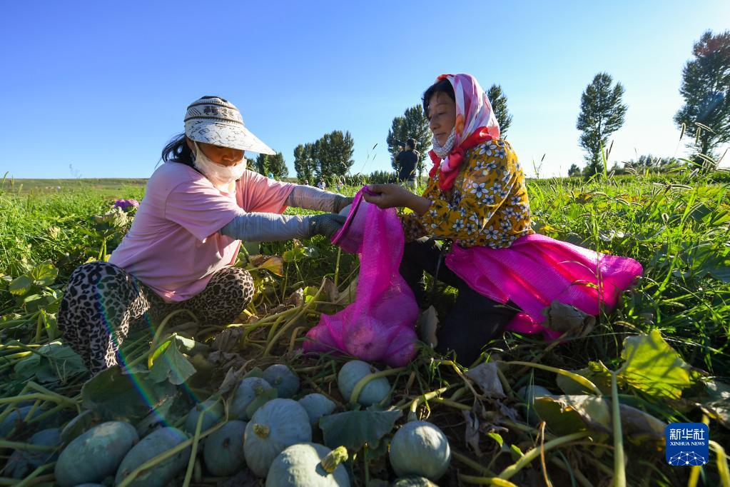 8月15日,種植戶(hù)將收獲的貝貝南瓜裝袋。