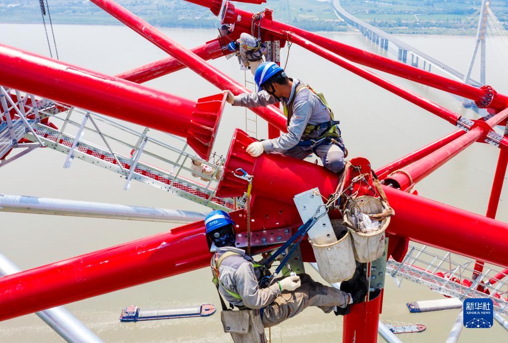 當日,位于安徽省銅陵市樅陽(yáng)縣的長(cháng)江跨越塔北塔封頂,標志著(zhù)“西電東送”重點(diǎn)工程白鶴灘至浙江±800千伏特高壓直流輸電工程安徽段長(cháng)江跨越塔全部組立完成。