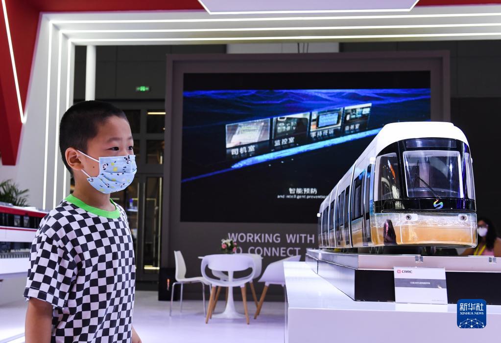 8月16日,在第六屆絲綢之路國際博覽會(huì )中國中車(chē)展區,一名小朋友參觀(guān)三亞100%低地板列車(chē)模型。