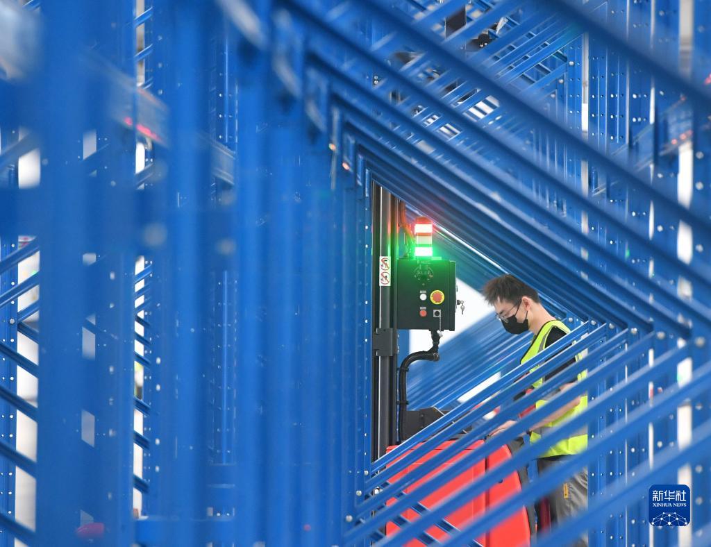 8月16日,在鄭州機場(chǎng)北貨運區倉庫,工作人員在調試自動(dòng)化導引叉車(chē)。