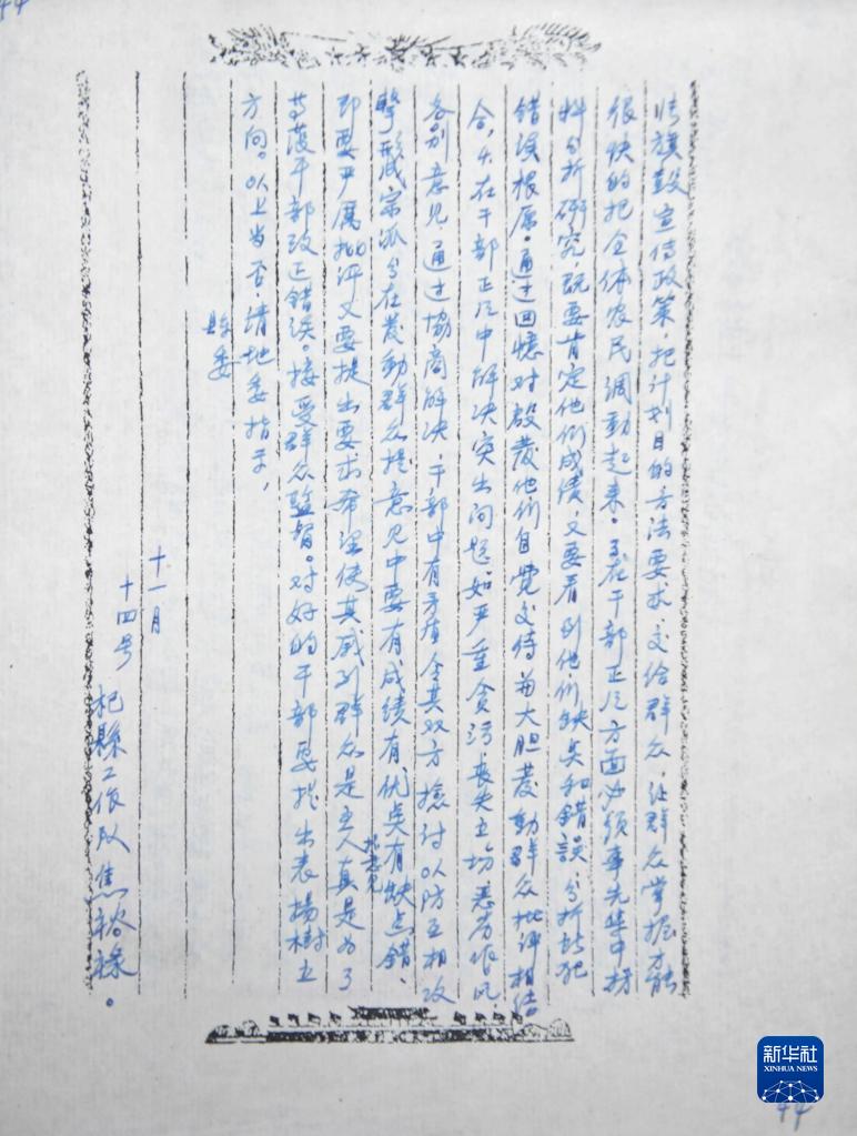 這是《杞縣一區謝砦鄉第一步工作報告》手稿尾頁(yè),落款為杞縣工作隊焦裕祿(2022年8月5日攝)。新華社記者 韓朝陽(yáng) 攝