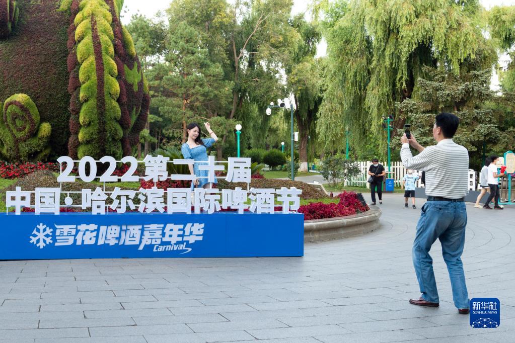 8月16日,游客在哈爾濱國際啤酒節現場(chǎng)留影。