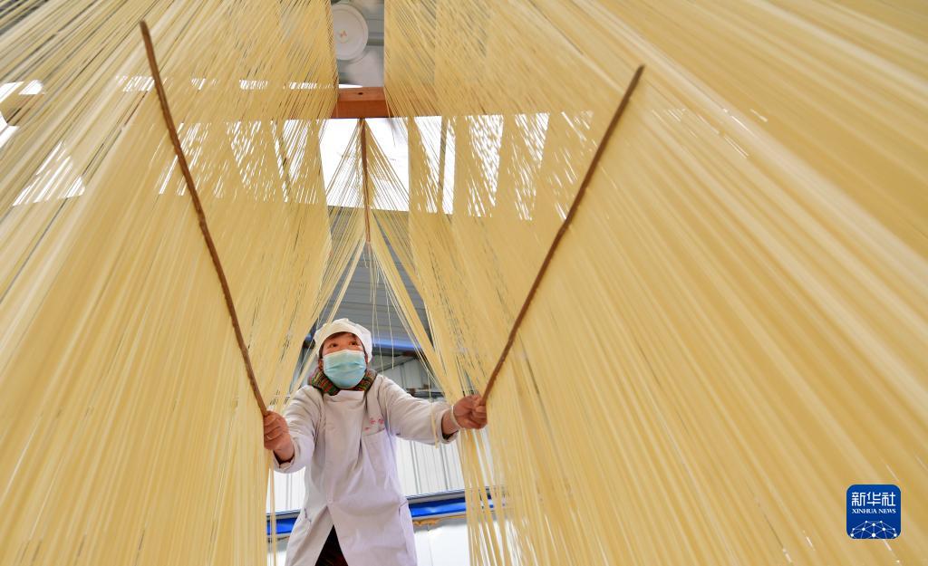 村民在李長(cháng)滿(mǎn)的老李家手工掛面專(zhuān)業(yè)合作社晾曬空心掛面(3月18日攝)。