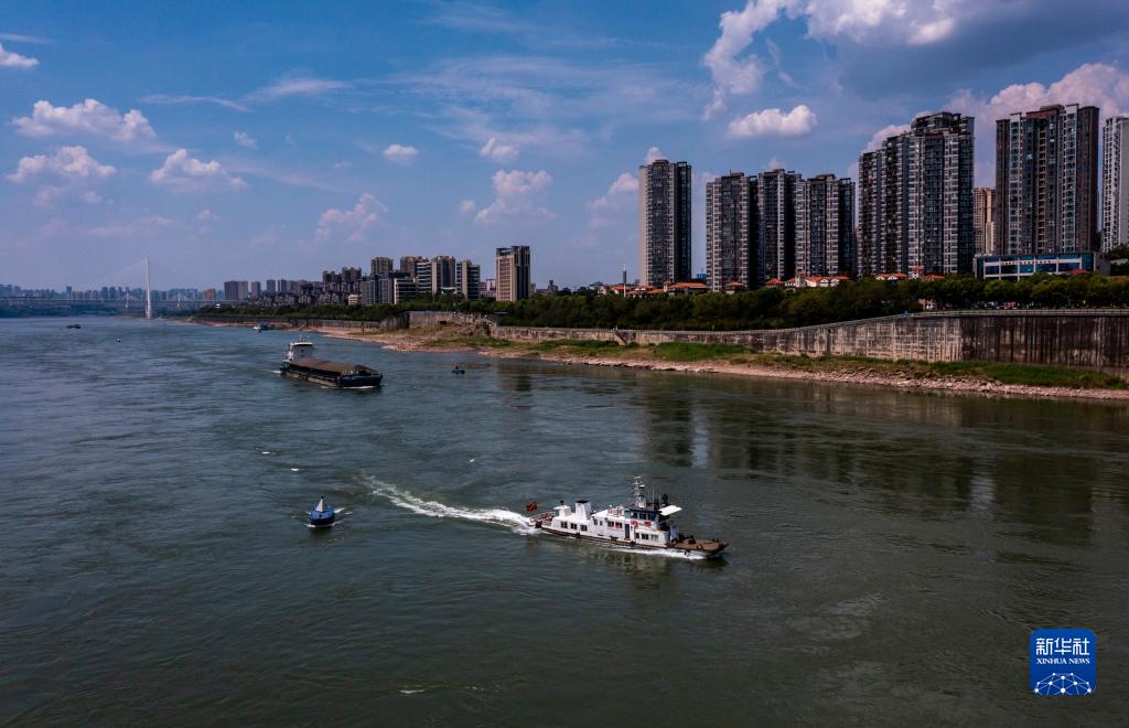 8月16日,長(cháng)江重慶航道局巴南航道處的一艘航道工作船在轄區的長(cháng)江水域上進(jìn)行巡查作業(yè)(無(wú)人機照片)。