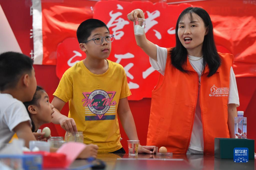 8月17日,在湘潭市雨湖區窯灣街道唐興寺社區,小朋友在觀(guān)看志愿者演示“浮起來(lái)的雞蛋”科學(xué)小實(shí)驗。