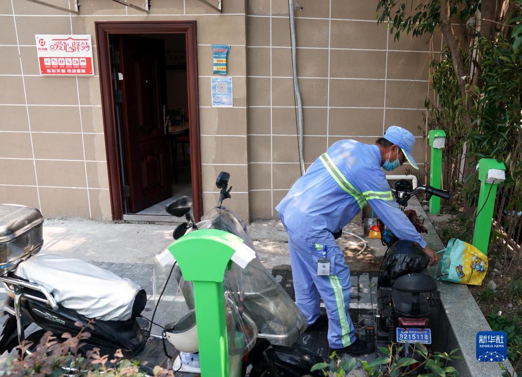 愛(ài)心驛站門(mén)口設置了電動(dòng)車(chē)充電樁,供戶(hù)外勞動(dòng)者免費使用(8月16日攝)。