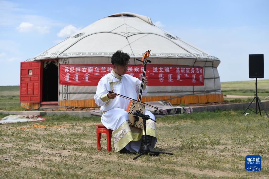8月17日,在敦達烏蘇嘎查演出點(diǎn),烏蘭牧騎隊員在表演節目。
