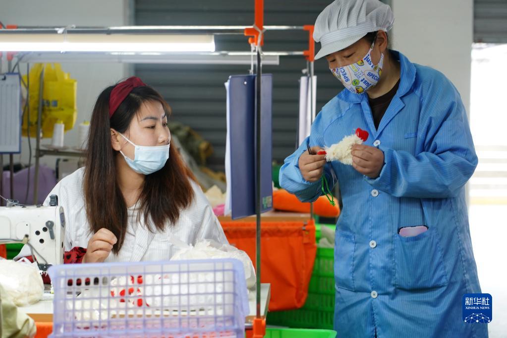 在老縣鎮一家毛絨玩具社區工廠(chǎng)內,技術(shù)工人(右)指導工友制作玩具(4月12日攝)。