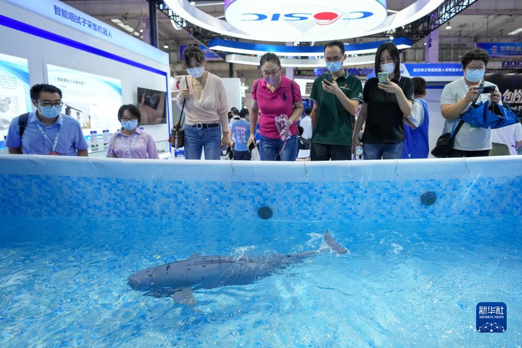 8月18日,參觀(guān)者在2022世界機器人博覽會(huì )上拍攝一款水下仿生機器人。