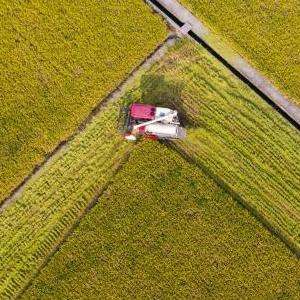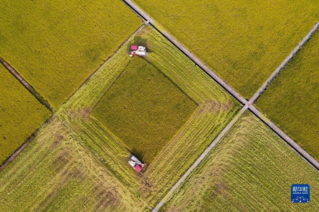 8月18日,在峨眉山市桂花橋鎮紅山村,兩臺收割機在收割水稻(無(wú)人機照片)。