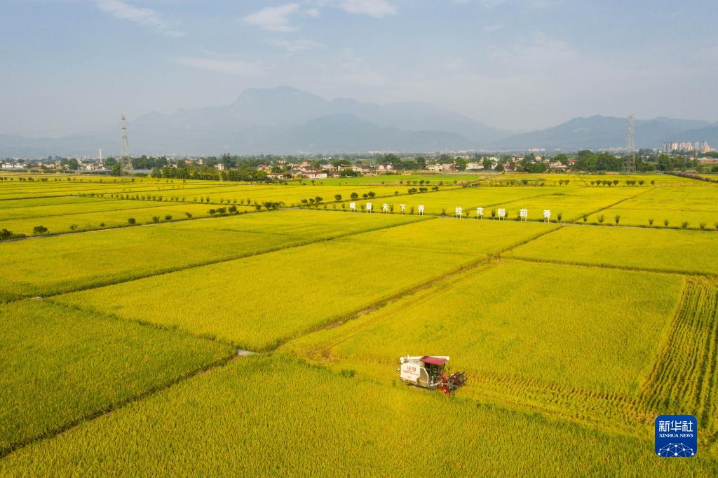 8月18日,在峨眉山市桂花橋鎮紅山村,一臺收割機在收割水稻(無(wú)人機照片)。
