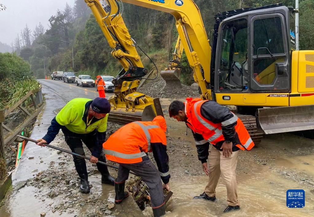 8月18日,在新西蘭南島納爾遜地區,當地市政工作人員檢查路面受洪水損壞的情況。