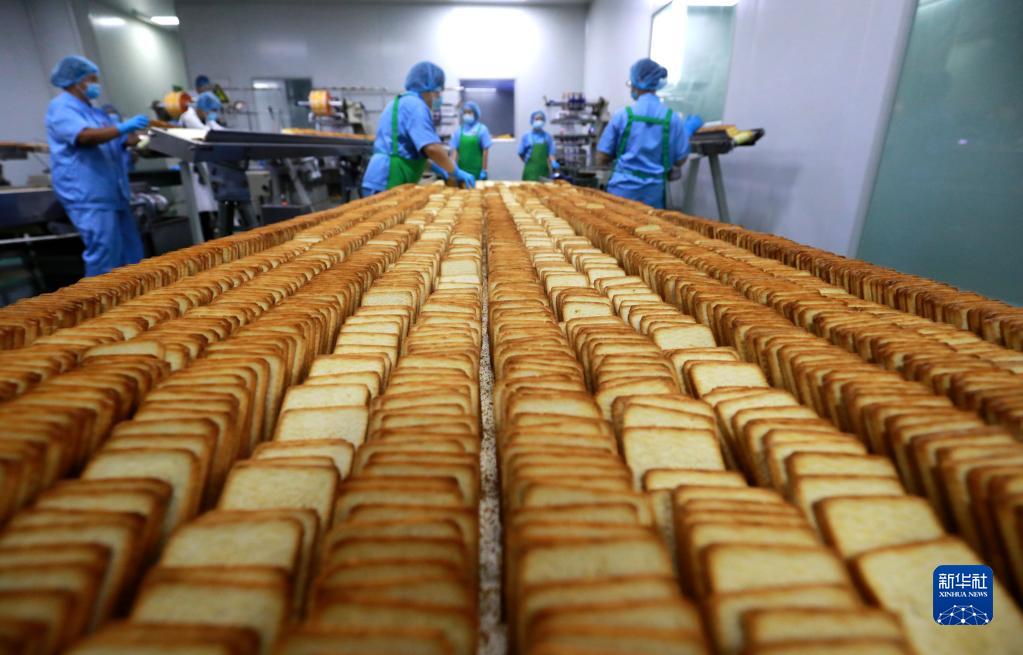 8月18日,在河北馬家麥坊食品有限公司饃片車(chē)間,工人在整理饃片。