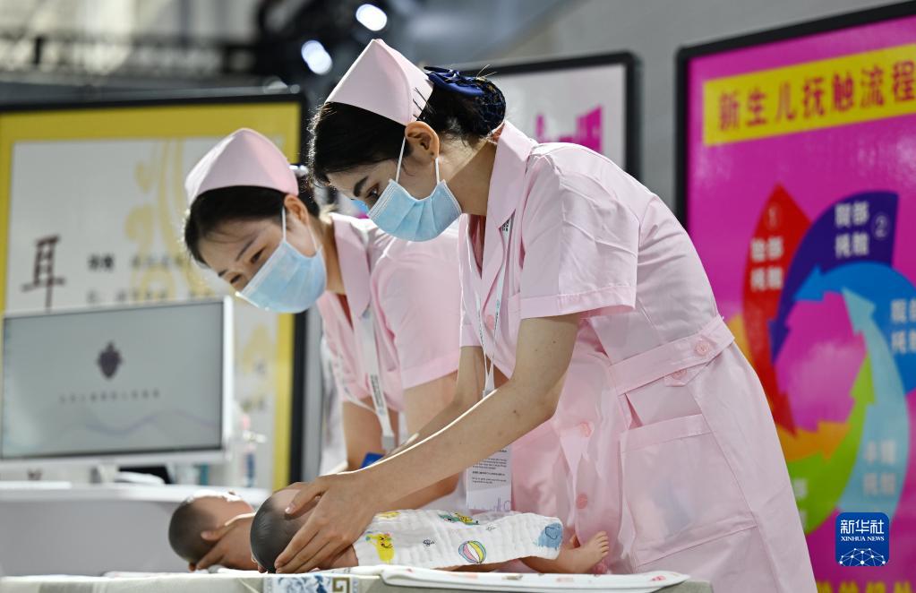 8月19日,在國家會(huì )展中心(天津),首屆世界職業(yè)院校技能大賽的參賽選手在演示新生兒撫觸。