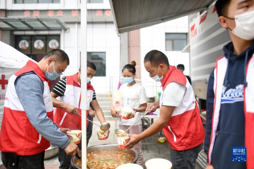 8月19日,青海省紅十字會(huì )工作人員在大通一中臨時(shí)安置點(diǎn)為受災群眾準備午餐。