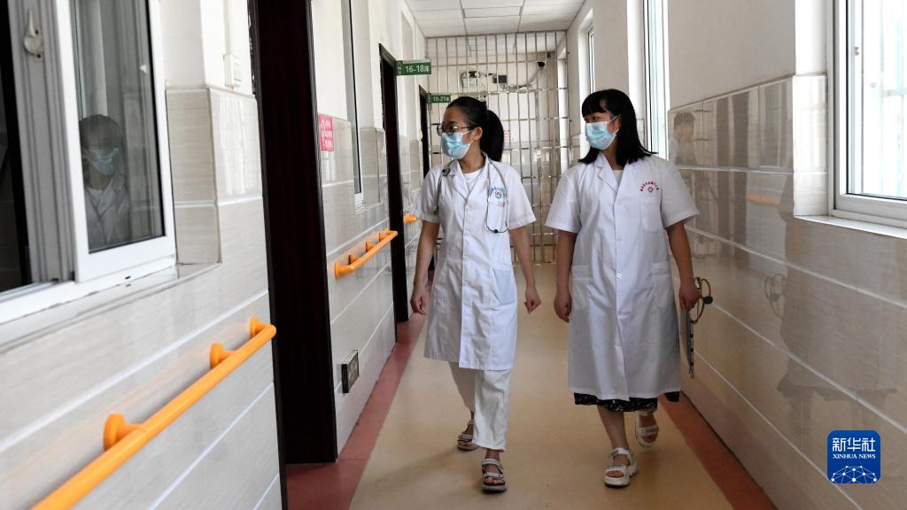 在融安縣長(cháng)安鎮衛生院,李秋菊(左)和同事在查房(8月19日攝)。